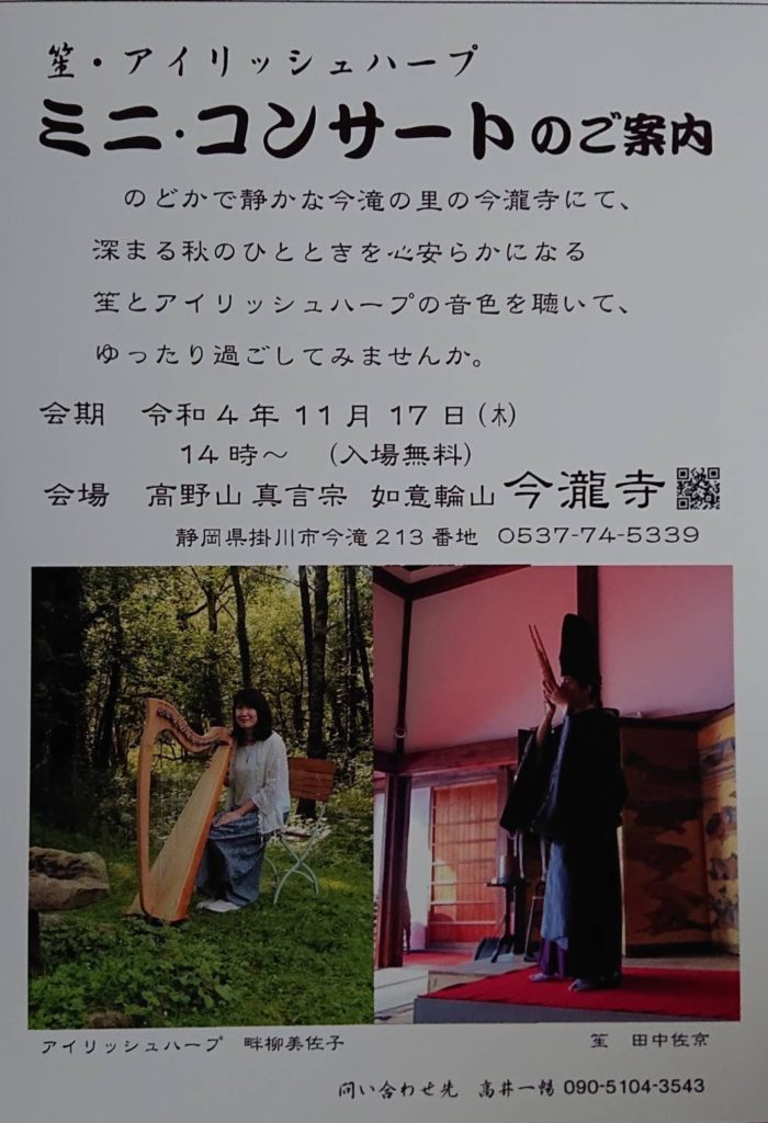 令和4年11月17日(木)に、笙とアイリッシュハープのミニコンサートを開催する運びとなりました。